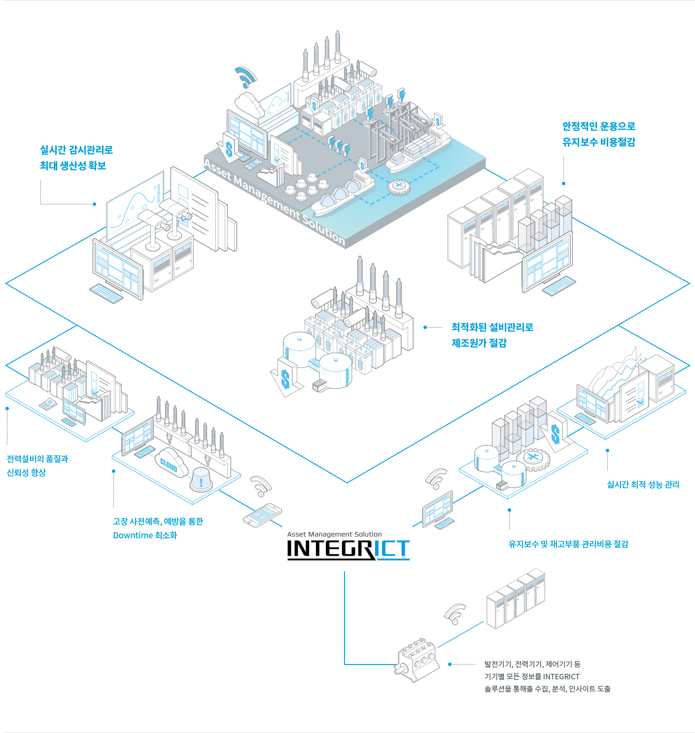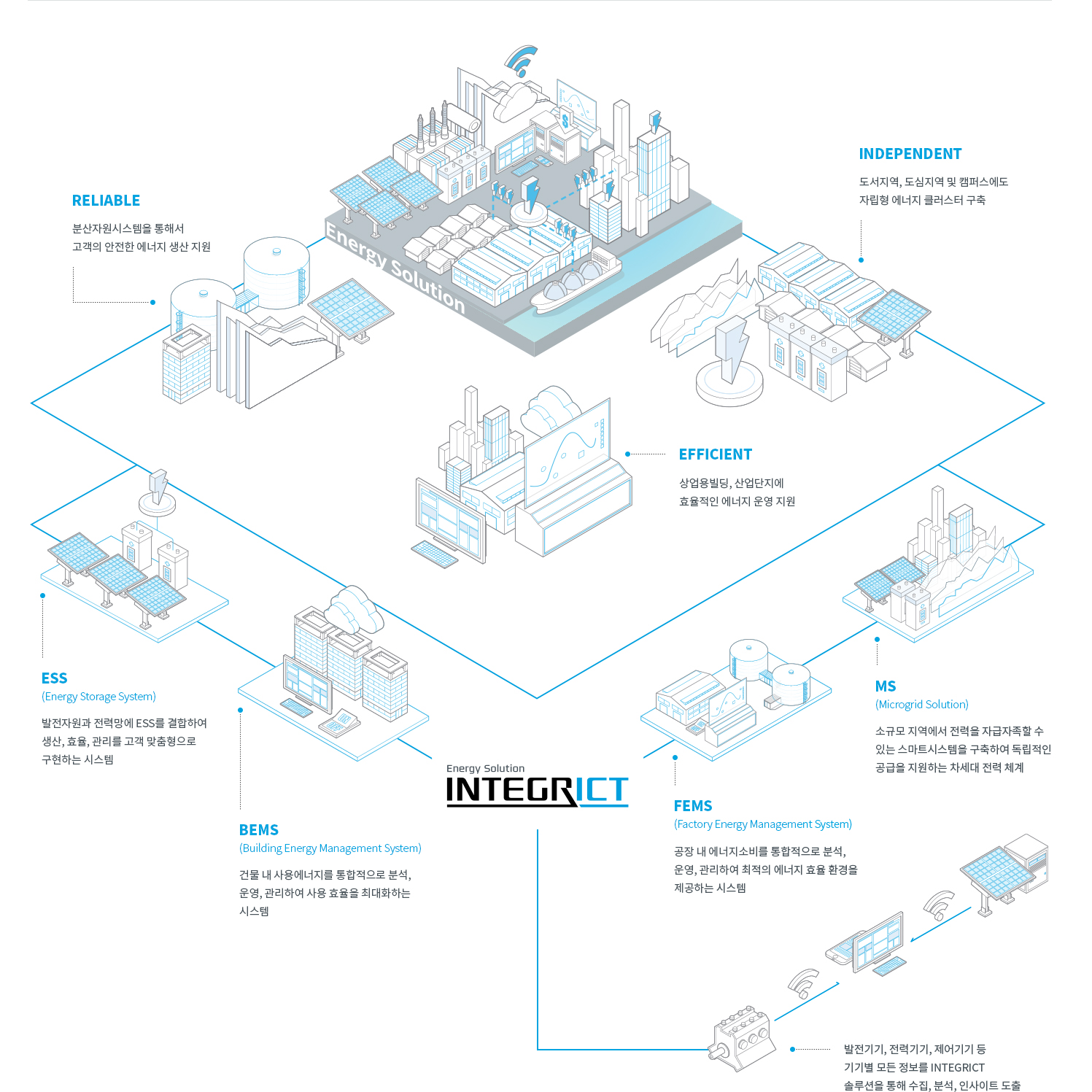 'INTEGRICT'는 고객에게 높은 에너지 효율, 높은 자산투자 효용을 제공하는 HD현대일렉트릭의 ICT 솔루션 브랜드입니다. 고객보다 고객자산을 더 잘 아는 스마트한 솔루션은 고객이 비즈니스의 성장에 집중할 수 있도록 고객자산을 최상의 상태로 유지하고 개선할 뿐 아니라, 자산 활용 분석을 기반으로 고객의 비즈니스를 성공으로 이끄는 insight를 제공합니다.