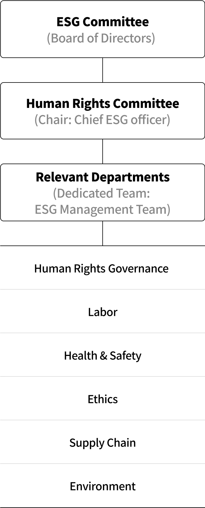 • The Company shall establish an internal system necessary for the implementation of human rights management in order to respect human rights in all business activities. The company's human rights management governance consists of the ESG Committee, Human Rights Management Committee, and related departments.